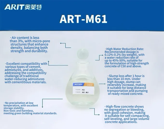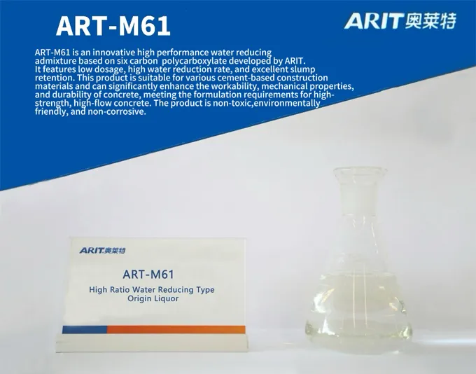 ART-M61A is an innovative C6-based polycarboxylate high range water reducing admixture independently developed by ARIT. It offers excellent workability, high water-reducing rate and minimal slump loss. Suitable for all kinds of cement-based materials, it significantly improves concrete workability, mechanical properties and durability, meeting the requirements of high-strength, high-fluidity concrete.