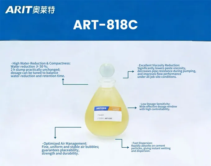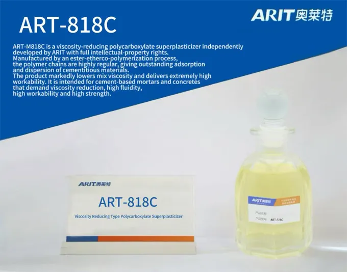 ART-M818C is a viscosity-reducing polycarboxylate superplasticizer independently developed by ARIT with full intellectual-property rights. Manufactured by an ester-ether co-polymerization process, the polymer chains are highly regular, giving outstanding adsorption and dispersion of cementitious materials. The product markedly lowers mix viscosity and delivers extremely high workability. It is intended for cement-based mortars and concretes that demand viscosity reduction, high fluidity, high workability and high strength.