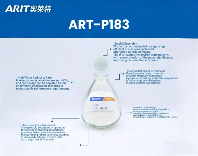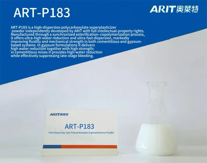 ART-P183 is a high-dispersion polycarboxylate superplasticizer powder independently developed by ARIT with full intellectual-property rights. Manufactured through a synchronized esterification – copolymerization process, it offers ultra-high water reduction andultra-fast dispersion, markedly improving fluidity and mechanical strength in both cementitious and gypsum-based systems. In gypsum formulations it delivers high water reduction together with high strength; in cementitious mixes it provides high water reduction while effectively suppressing late-stage bleeding.