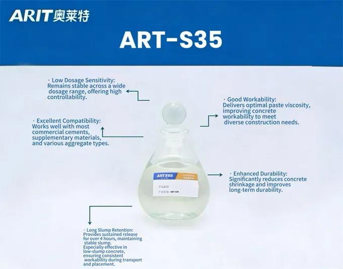 A Zhejiang supplier had to haul concrete > 2h to an infrastructure site where aggregate quality varied from load to load. ART-S35 kept the mix stable for 4 h without segregation or bleeding; its low-sensitivity chemistry cancelled the effect of raw-material fluctuations and guaranteed successful long-distance pumping even in midsummer heat.
