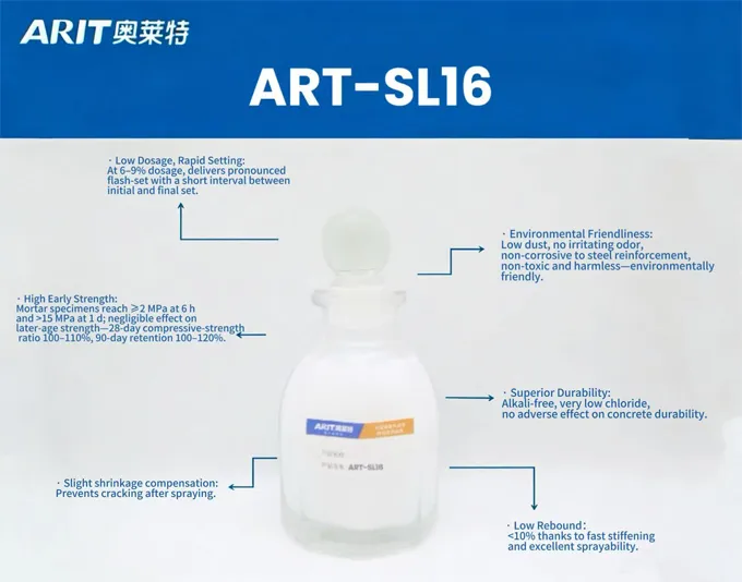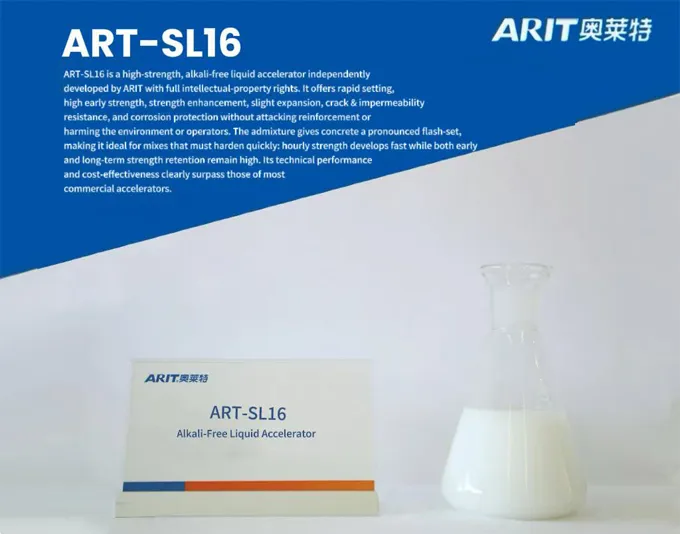 ART-SL16 is a high-strength, alkali-free liquid accelerator independently developed by ARIT with full intellectual-property rights. It offers rapid setting, high early strength, strength enhancement, slight expansion, crack & impermeability resistance, and corrosion protection without attacking reinforcement or harming the environment or operators. The admixture gives concrete a pronounced flash-set, making it ideal for mixes that must harden quickly: hourly strength develops fast while both early and long-term strength retention remain high. Its technical performance and cost-effectiveness clearly surpass those of most commercial accelerators.