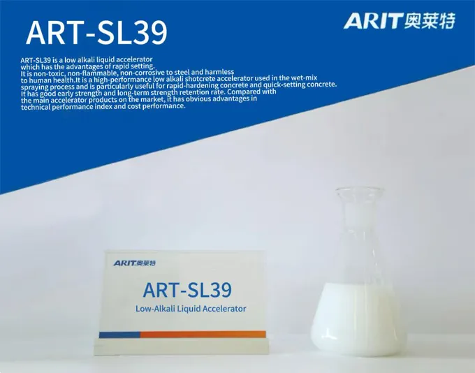 ART-SL39 is a low alkali liquid accelerator which has the advantages of rapid setting. It is non-toxic, non-flammable, non-corrosive to steel and harmless to human health. It is a high-performance low alkali shotcrete accelerator used in the wet-mix spraying process and is particularly useful for rapid-hardening concrete and quick-setting concrete. It has good early strength and long-term strength retention rate. Compared with the main accelerator products on the market, it has obvious advantages in technical performance index and cost performance.