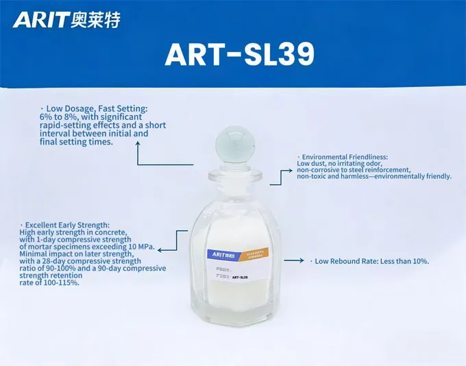 On a tunnel section of the Changjing-Huang Railway, high accelerator dosage caused excessive rebound and sub-standard early strength (1-day mortar strength only 3.4 MPa, below the 7 MPa national limit). After switching to our ARIT-SL39, dosage dropped from 8–9 % to 5–6 %, rebound fell markedly and 1-day compressive strength reached 9 MPa, comfortably exceeding the code requirement and keeping the job running smoothly.