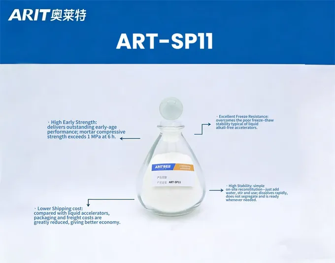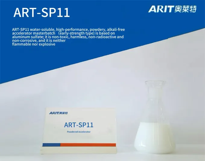 ART-SP11 water-soluble, high-performance, powdery, alkali-free accelerator masterbatch (early-strength type) is based on aluminum sulfate; it is non-toxic, harmless, non-radioactive and non-corrosive, and it is neither flammable nor explosive.